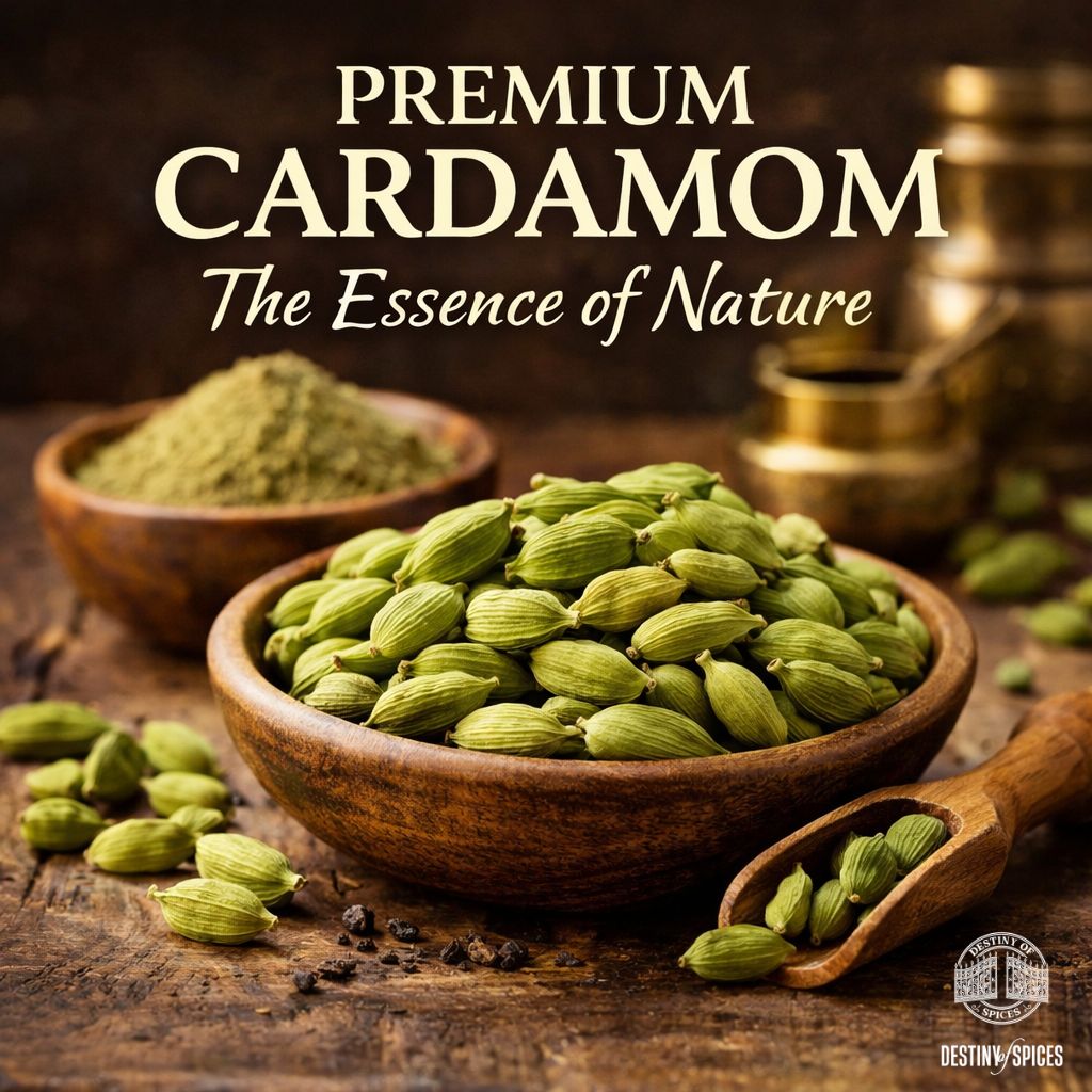 Experience the rich aroma and exceptional flavour of Destiny of Spices Premium Green Cardamom (Elaichi), sourced directly from the high-altitude plantations of the Western Ghats, Kerala — globally renowned for producing the finest quality cardamom. Our green cardamom is 100% chemical-free, pesticide-free, and unadulterated, cultivated naturally in fertile mountain soil and harvested at peak maturity to preserve its essential oils, vibrant green colour, and bold aroma.